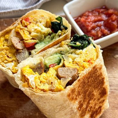 Beef sausage, hashbrown, grilled bacon, baked beans, sautéed mushrooms, avocado, spinach, & egg wrapped in whole grain tortilla.